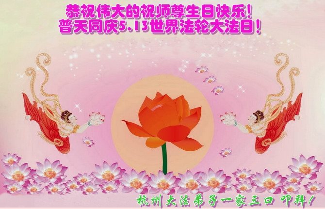 在5.13普天同庆法轮大法日来临之际,浙江杭州大法弟子一家三口恭祝伟大的师尊生日快乐! 感谢师尊的慈悲救度。弟子一定尽力做好三件事,多救人。 浙江省嘉兴市海宁市大法弟子恭祝师尊生日快乐!