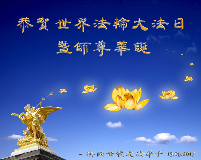 【明慧网二零一七年五月十二日】 法国全体法轮大法弟子恭贺世界法轮大法日暨师尊华诞!