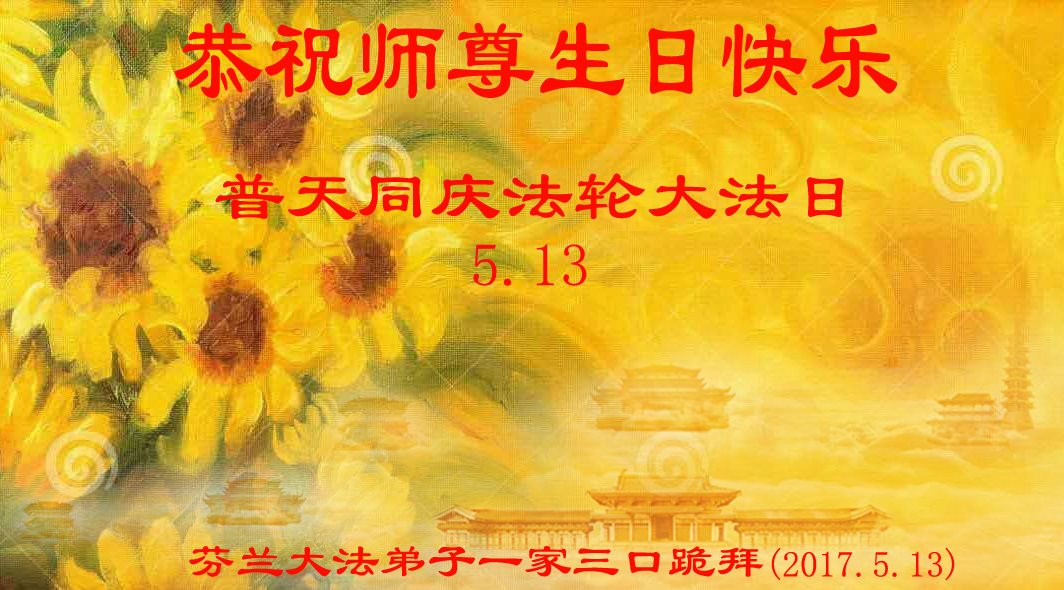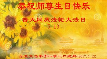 芬兰大法弟子一家三口恭祝师尊生日快乐!
