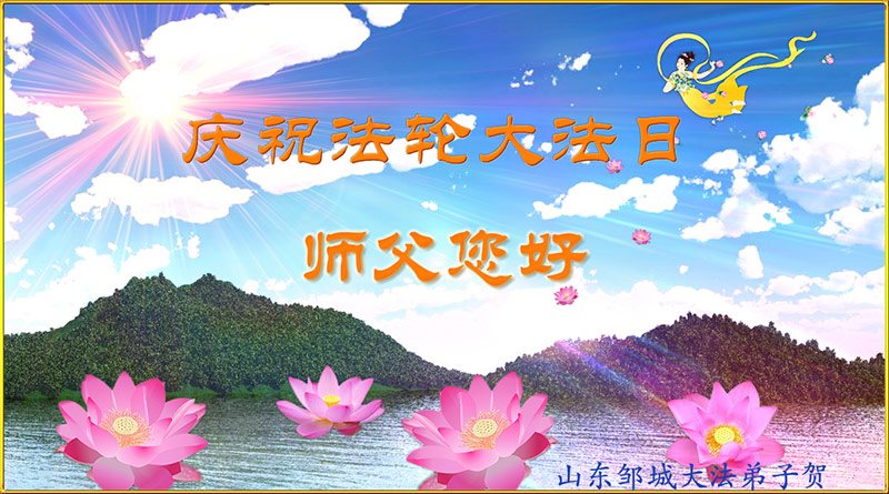 山东省邹城市大法弟子恭贺法轮大法日!祝贺慈悲伟大的师父生日快乐!