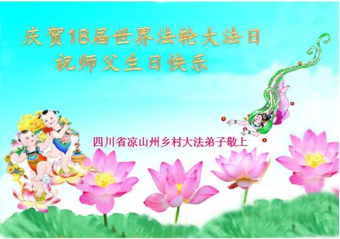 【明慧网二零一七年五月十二日】 四川凉山州乡村大法弟子庆贺世界法轮大法日!祝师父生日快乐!