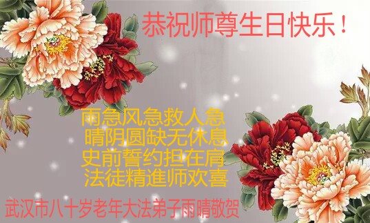 雨急风急救人急 晴阴圆缺无休息, 史前誓约担在肩 法徒精進师欢喜 湖北省武汉大法弟子明明、腊英恭祝师尊生日快乐!