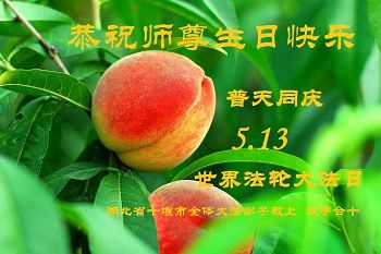伟大的师尊您好!5月13日是世界法轮大法日,是师尊向宇宙内众生开始传授宇宙大法的日子,是宇宙众生永远都最值得纪念的日子。在世界法轮大法日暨师尊生日即将到来之际,我谨代表湖北全体大法弟子向师尊表达最最崇高的敬礼!感谢师尊对全人类的救度之恩! 湖北省孝感市应城市全体大法弟子恭祝慈悲伟大的师父生日快乐!祝贺世界法轮大法日!