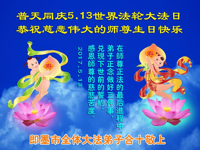 我们一定要正念正行,勇猛精進,找自己、去执着,多救人,走好走正最后的修炼路,完成伟大的历史使命。 山东省青岛市即墨市全体大法弟子恭祝慈悲伟大的师尊生日快乐!普天同庆世界法轮大法日!