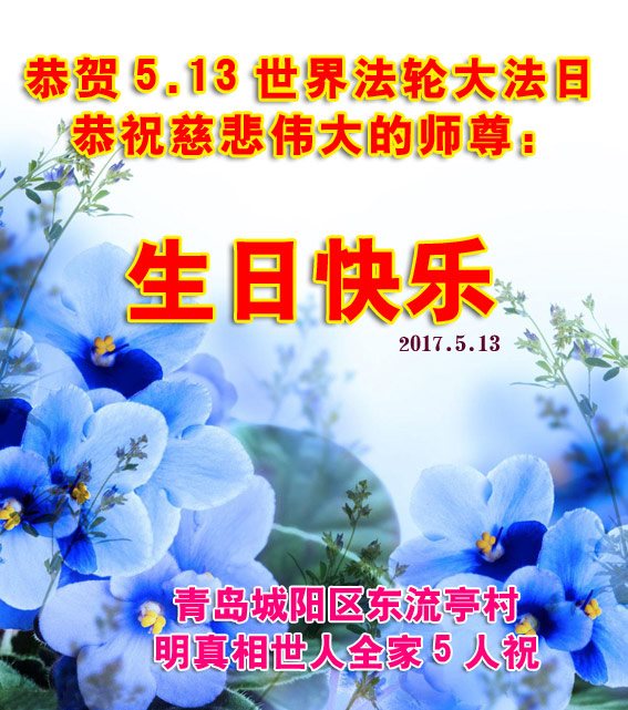 山东省青岛大法弟子全家恭祝师尊生日快乐!普天同庆世界法轮大法日暨法轮大法洪传二十五周年!