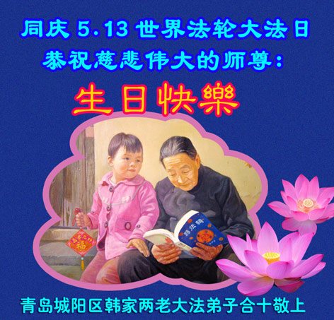 山东省青岛市城阳区韩家两老大法弟子恭祝慈悲伟大的师尊生日快乐!同庆世界法轮大法日!