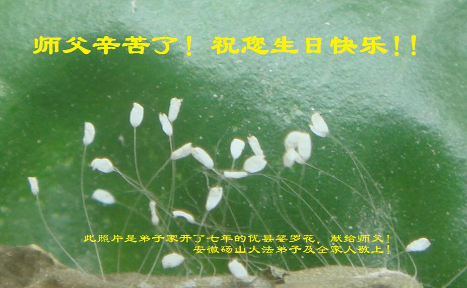 安徽省宿州市砀山县大法弟子及全家人祝师尊生日快乐! 此照片是弟子家开了七年的优昙婆罗花,献给师父。 回顾十七年的修炼路程,能平稳的走到今天,时时处处,每时每刻都是有师父的慈悲保护。弟子感恩师尊的慈悲苦度,感谢师父对弟子的教导和时时看护,弟子无以回报,只有精進实修,听师父的话,做个合格的大法弟子。在圆满的路上勇猛精進! 安徽砀山大法弟子及全家人敬上! 安徽合肥市一老年大法弟子恭贺法轮大法日!