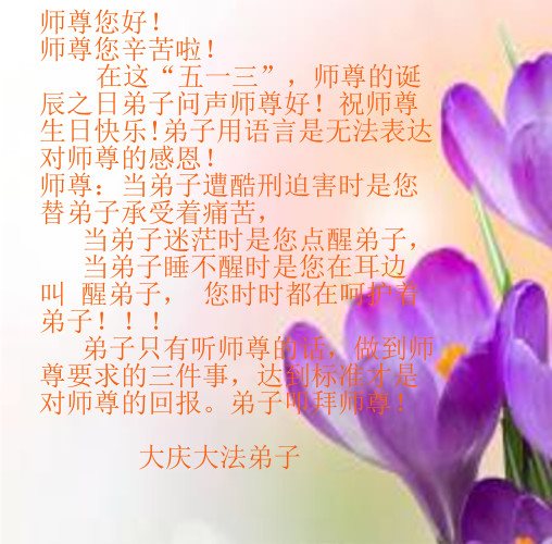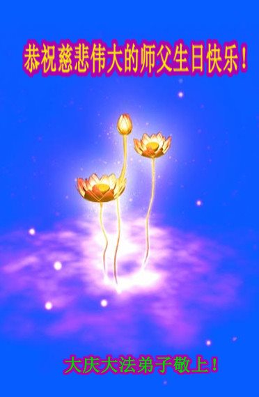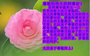 师尊您好! 师尊您辛苦啦! 在这“五一三”,师尊的华诞之日弟子问声师尊好!祝师尊生日快乐!弟子用语言是无法表达对师尊的感恩! 师尊:当弟子遭酷刑迫害时,是您替弟子承受着痛苦, 当弟子迷茫时是您点醒弟子, 当弟子睡不醒时是您在耳边叫醒弟子,您时时都在保护着弟子! 弟子只有听师尊的话,做到师尊要求的三件事,达到标准才是对师尊的回报。 大庆弟子叩拜师尊! 黑龙江省大庆大法弟子恭祝师父生日快乐!