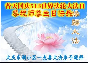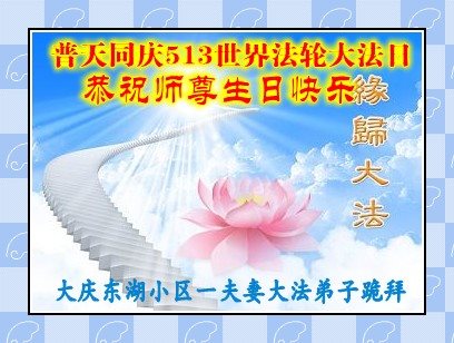 黑龙江省大庆东湖小区一大法弟子夫妻恭祝师尊生日快乐!暨5.13世界法轮大法日!