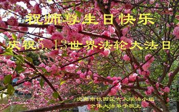 恭贺世界法轮大法日!暨法轮大法传世二十五周年!并贺李洪志师父六十六岁华诞! 感谢大法师父救度之恩! 呵护弟子在正法修炼路上不断前行。 弟子一定精進,再精進,洗净自己,多救众生随师还! 辽宁省沈阳一学法小组大法弟子恭祝师尊生日快乐!