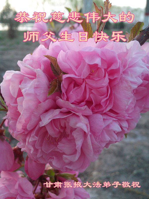 在大法洪传二十五周年来临之际,也是伟大的师父六十六华诞生日之时,张掖四名大法弟子提前给师父跪拜: 恭祝师父生日快乐! 在证实法的路上,在师父的保护和加持下走到了今天。无论在多么艰难的环境中都动摇不了弟子们对师父对大法的坚信,同时弟子们还有许多需要修去的执着赶快修去,在救度众生讲真相方面做的也有差距,弟子们会抓紧时间做的更好。 恭祝慈悲伟大的师父生日快乐! 二零一七年四月二十六日 甘肃张掖大法弟子恭祝慈悲伟大的师父生日快乐!师父您辛苦了!