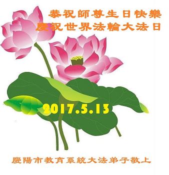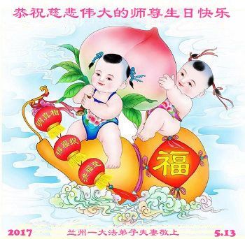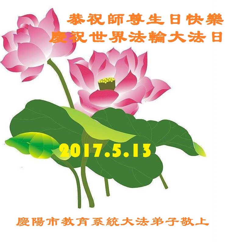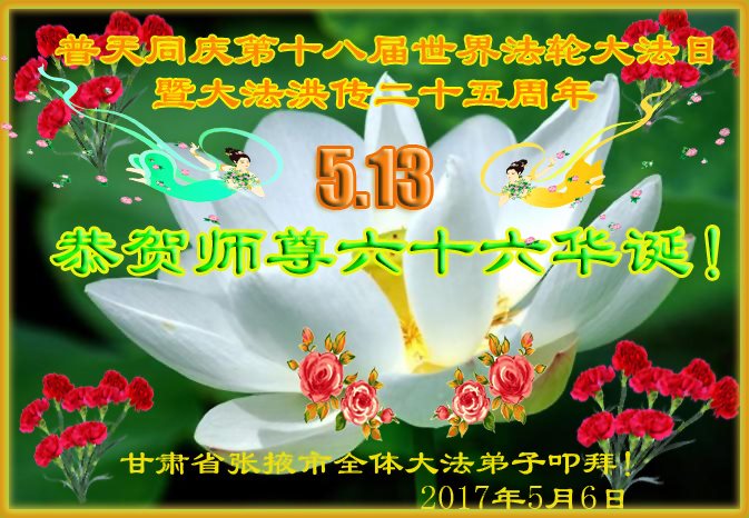 恭贺慈悲伟大的师尊生日快乐!恭贺大法洪传25周年暨第十八届世界法轮大法日! 历经风风雨雨,在这普天同庆的日子里,更加感恩师尊慈悲救度众生的浩荡洪恩,更加珍惜大法和这稍纵即逝的万古机缘!最后的时刻,我们一定更加勇猛精進,做好三件事,多向内找,多救人,努力做到修炼如初,跟师尊圆满回家! 张掖市全体大法弟子叩拜! 2017年5月7日 甘肃白银市会宁县大法弟子恭祝师尊生日快乐!
