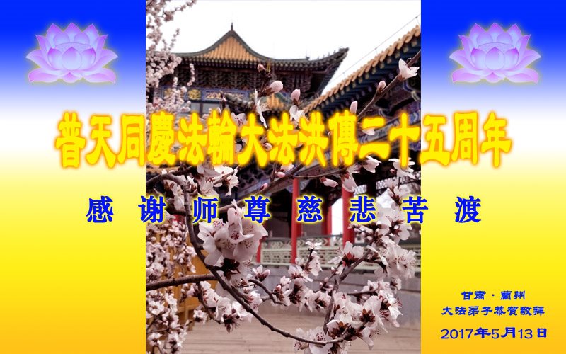甘肃兰州大法弟子恭祝伟大慈悲的师父生日快乐!恭祝法轮大法洪传世界25周年!感谢师父的慈悲救度!