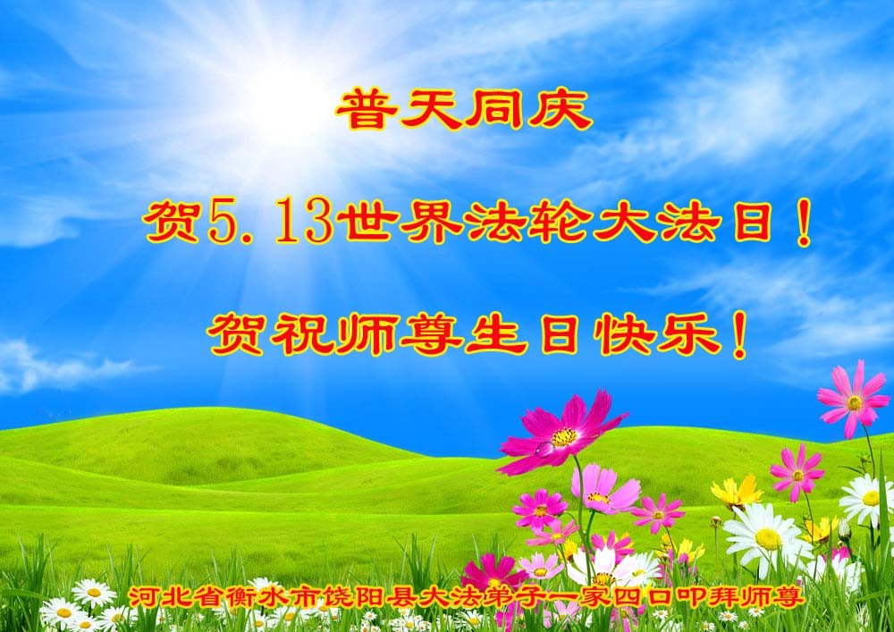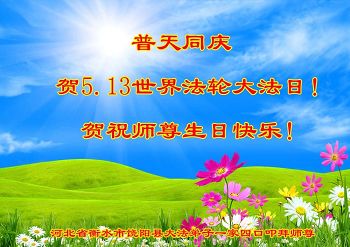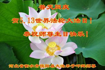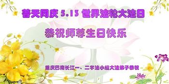 值此佳节同修们都表示要踏踏实实讲真相,完成救人的历史使命,不给自己的修炼留下遗憾,让师尊多一份欣慰少一份操劳。 重庆市巴南区鱼洞兴隆学法小组全体大法弟子敬上 河北省衡水市饶阳县大法弟子普天同庆,恭贺世界法轮大法日,恭祝慈悲伟大的师父生日快乐!