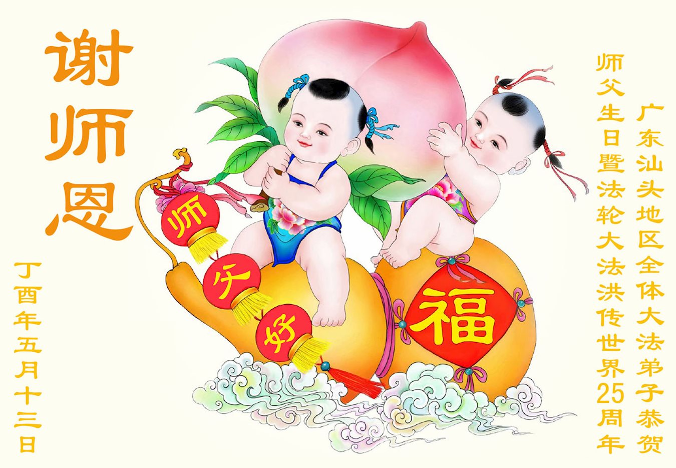 广东汕头地区全体大法弟子恭贺师父生日暨法轮大法洪传世界25周年!
