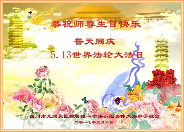 四川南充顺庆区搬罾镇一学法小组全体大法弟子恭祝师尊生日快乐!普天同庆5.13世界法轮大法日!