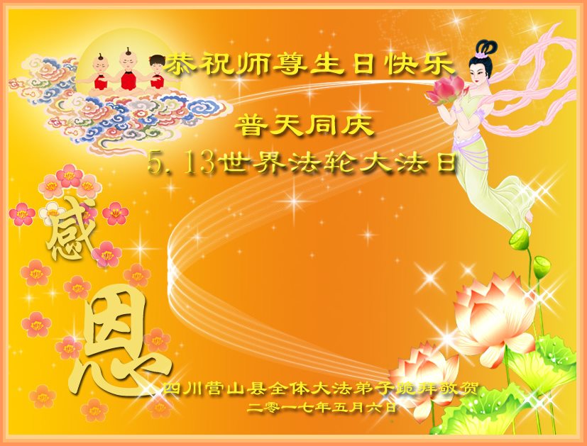 感谢师尊慈悲救度!弟子一要努力做好三件事,“圆满随师还”。 四川省南充市营山县全体大法弟子恭祝师尊生日快乐!