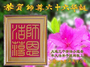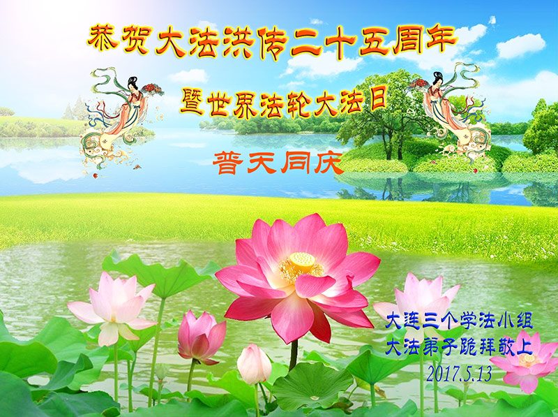 您的弟子谨遵师尊教诲,修好自己,多向内找,向内修,修掉各种执着心,整体配合好,努力继续做好三件事,救度更多众生,兑现我们的承诺和誓约,让师尊放心!我们想念师尊,感谢师尊慈悲救度、呵护!我们一定谨记师尊教诲,多学法、学好法,修去人心,转变观念,努力做好三件事,兑现誓约,跟师父回家! 辽宁省大连三个学法小组老年大法弟子恭贺法轮大法洪传二十五周年暨世界法轮大法日!恭贺慈悲伟大的师尊华诞!