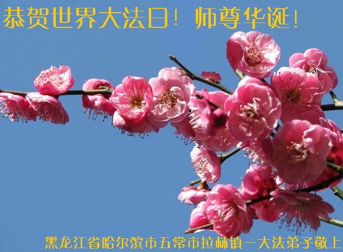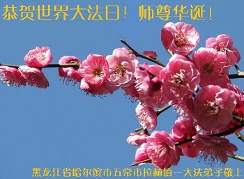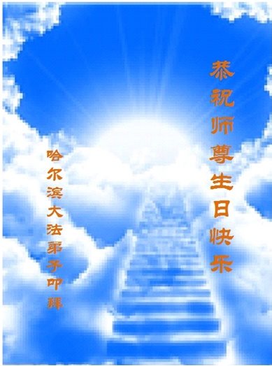 我们一定珍惜师尊用巨大的承受延续来的修炼时间,学好法,修好自己,整体配合,多救众生! 黑龙江省哈尔滨一中年大法弟子恭祝师尊华诞!庆祝世界法轮大法日!庆祝法轮大法洪传二十五周年!
