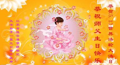 江苏省连云港市赣榆区大法弟子一家三口普天同庆世界法轮大法日!恭贺师尊生日快乐!