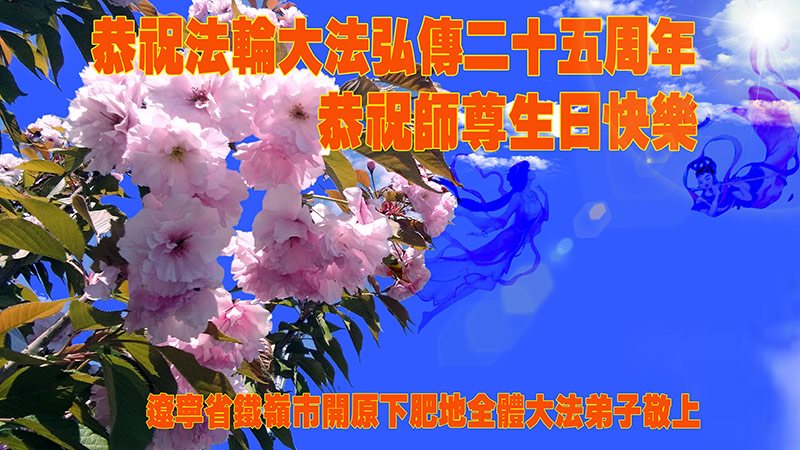 喜庆圣日五•一三, 多少艰辛师承担。 弟子铭记佛恩度, 洒脱救人行世间。 满院花盛敬师尊, 淡淡香飘入心甘。 辽宁省铁岭市开原下肥地全体大法弟子恭祝师尊生日快乐!恭贺法轮大法洪传二十五周年!