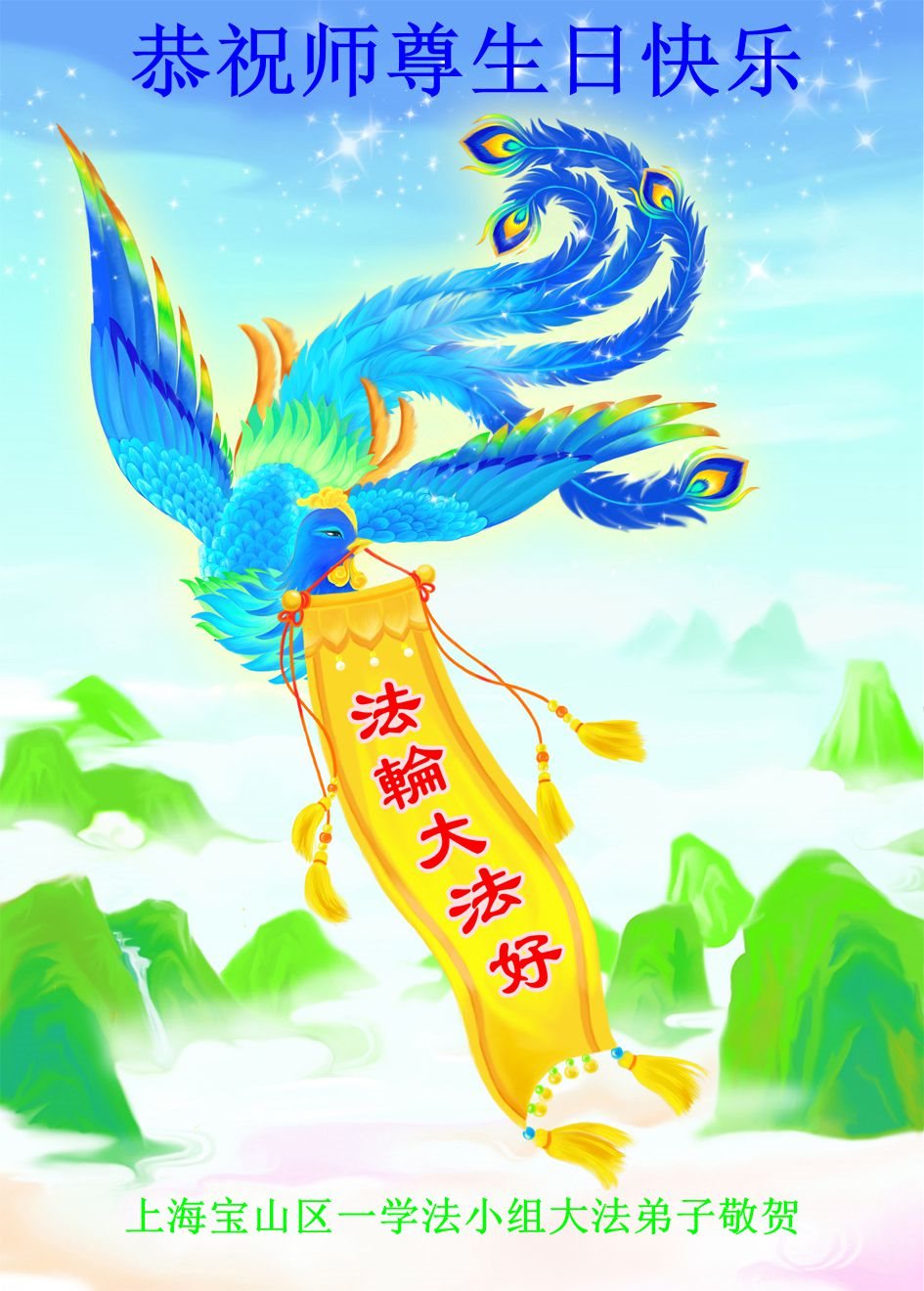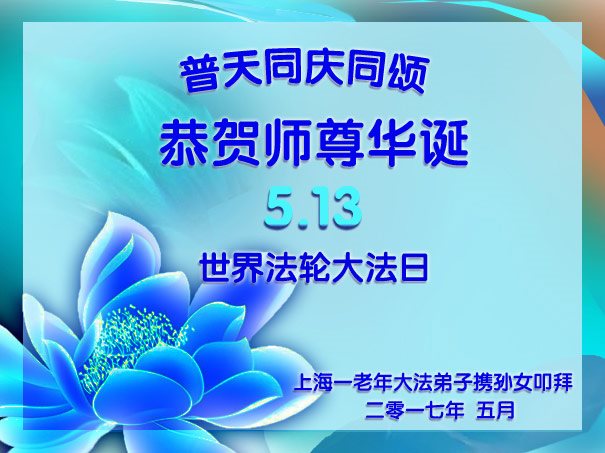 四川省一大法弟子的亲朋、在上海的家人、同修恭祝师父生日快乐!恭贺世界法轮大法日! 谢谢师父慈悲救度,感恩浩荡佛恩! 上海一大法弟子全家恭祝慈悲伟大的师父生日快乐!同庆世界法轮大法日!