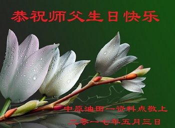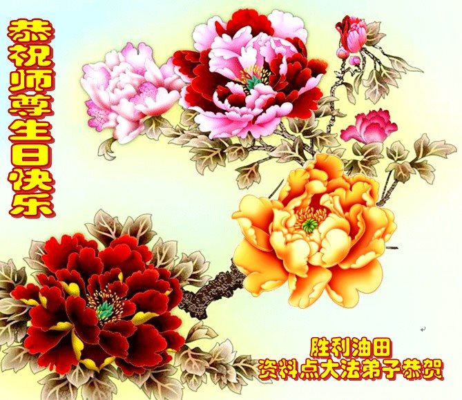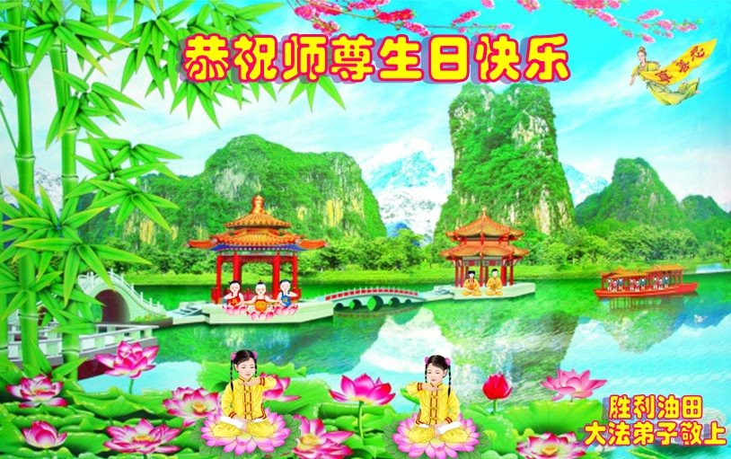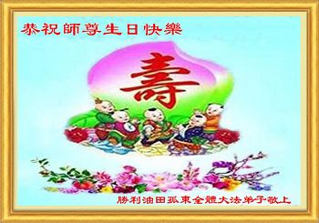 敬祝师父生日快乐! 师父辛苦了! 回首二十三年来,自己悟性低,修炼行为一直很差,师父为我这不争气的弟子多付出了很多很多才把我带到今天。师父的巨大承受换来了延续的时间,我才有机会还在实修。报师恩的心无法言表,只有修成一颗纯善的心,达到大法弟子的心性标准、证实大法、多救人才对得起师父。 叩首拜师父 双手合十 大陆山东东营胜利油田大法弟子 黑龙江大庆采油三厂大法弟子恭祝慈悲伟大的师尊生日快乐!