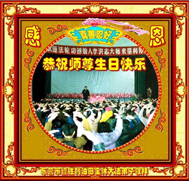 山东东营胜利油田全体大法弟子敬祝师尊生日快乐!恭贺世界法轮大法日!穷尽宇宙众生所有的智慧,也难以洞彻无量大法之博大内涵。宇宙根本大法的传出,是师尊对众生的垂恩与慈悲。师父的巨大付出,成就了我们今天正法修炼、救度世人的路。弟子们唯有精進、多救世人以报师恩! 山东东营胜利油田全体大法弟子敬上 胜利油田资料点大法弟子恭祝慈悲伟大的师尊生日快乐!