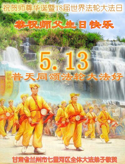 弟子想念师父,盼望师父早日回到家乡长春。我们一定努力做好三件事,助师正法多救人,精進实修,做一名合格的大法弟子,圆满随师还。感恩师父的慈悲苦度。 甘肃省兰州市七里河区全体大法弟子普天同庆慈悲伟大的师尊华诞!普天同庆第十八届“世界法轮大法日”!普天同庆法轮大法洪传全世界25周年!