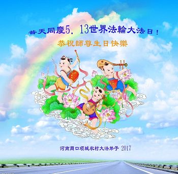 请师尊放心,在修炼中,我们要不断的精進,走好师父安排的路,跟师父回到自己真正的家园。 河南周口项城农村大法弟子向师父问好!庆祝5.13世界法轮大法日并恭祝师尊生日快乐!