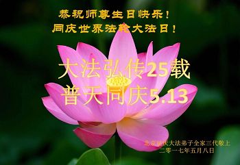 值此普天同庆、同祝、同贺法轮大法洪传二十五周年之际,吉林省长春市西南湖大路大法弟子恭祝、恭祝慈悲伟大师尊华诞暨世界法轮大法日! 二零一七年五月十三日 河南省新乡县一中年大法弟子恭贺法轮大法日!