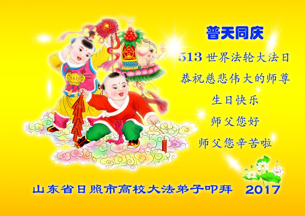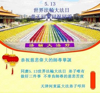 普天同庆5.13法轮大法洪传二十五周年! 七台河市金沙新区一大法弟子敬上! 山东省日照市高校大法弟子恭贺世界法轮大法日!