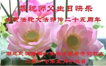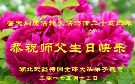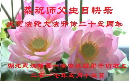 湖北武昌杨园一学法小组弟子恭祝师父生日快乐!感恩师父时刻对弟子的一路慈悲呵护,庆贺法轮大法开传二十五周年! 山东烟台招远市女儿和母亲大法弟子恭祝慈悲伟大的师父生日快乐!