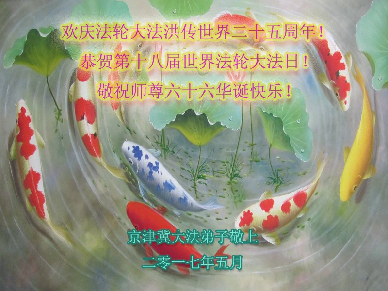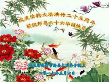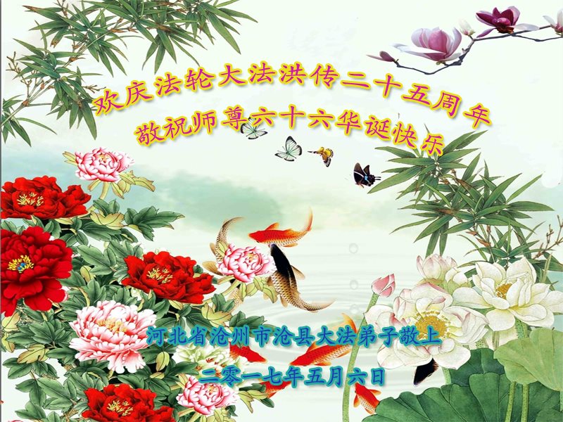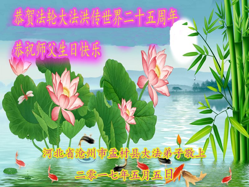 欢庆法轮大法洪传世界二十五周年!恭贺第十八届世界法轮大法日!敬祝师尊六十六华诞快乐! 河北省沧州市孟村县大法弟子 敬上 二零一七年五月五日 北京市朝阳区大法弟子祝师父生日快乐!