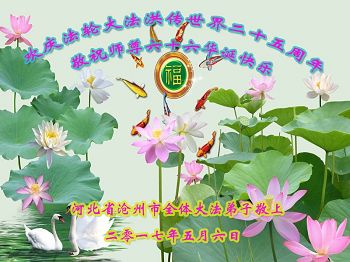 欢庆法轮大法洪传世界二十五周年!恭贺第十八届世界法轮大法日!敬祝师尊六十六华诞快乐! 河北省沧州市东光县大法弟子 敬上 二零一七年五月六日 河北省沧州市黄骅市大法弟子恭贺法轮大法日!