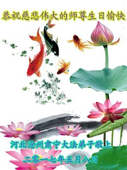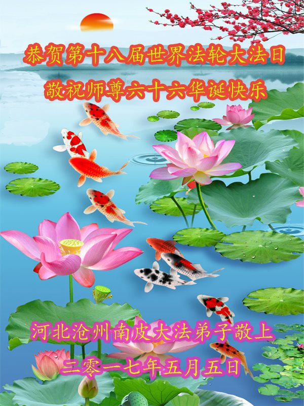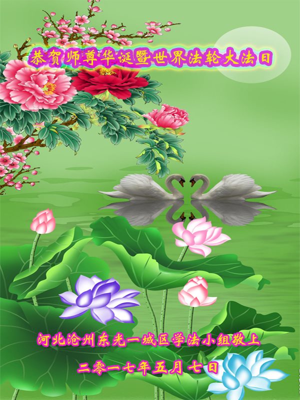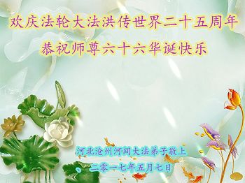 欢庆法轮大法洪传世界二十五周年!恭贺第十八届世界法轮大法日!敬祝师尊六十六华诞快乐! 河北省沧州市河间市大法弟子 敬上 二零一七年五月七日 河北省沧州市东光县大法弟子恭贺法轮大法日!