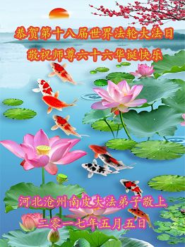 欢庆法轮大法洪传世界二十五周年!恭贺第十八届世界法轮大法日!敬祝师尊六十六华诞快乐! 河北省沧州市南皮县大法弟子 敬上 二零一七年五月五日 北京市朝阳区大法小弟子祝师父生日快乐!