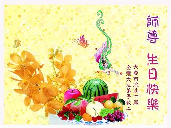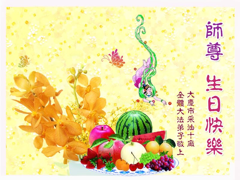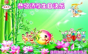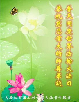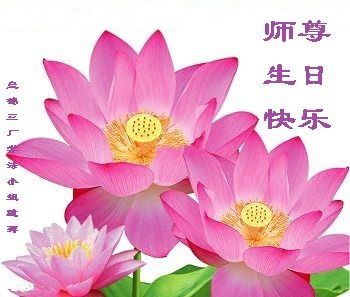弟子把千言万语想对师尊倾诉的话和家人在大法中受益的感恩,化作实际行动,做好三件事,圆满随师还! 山东潍坊化纤厂一大法弟子全家跪拜师尊! 辽宁盘锦化工三厂大法弟子恭祝慈悲伟大的师尊生日快乐!同祝世界法轮大法日!