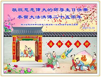 慈悲伟大的师父:您辛苦了! 在“五·一三”这普天同庆的神圣日子到来之际,弟子万分感谢师尊慈悲保护与救度之恩,在此,弟子和家人恭祝师父生日快乐!恭贺大法洪传二十五周年!庆祝世界法轮大法日!弟子必须学好法,讲好真相,救度众生,做好三件事,兑现誓约,完成使命,圆满随师还。 达州市开江县教育系统大法弟子热烈庆祝世界法轮大法日!