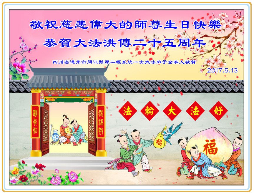 四川省达州市开江县原二轻系统一女大法弟子全家人敬祝慈悲伟大的师尊生日快乐!恭贺大法洪传二十五周年!