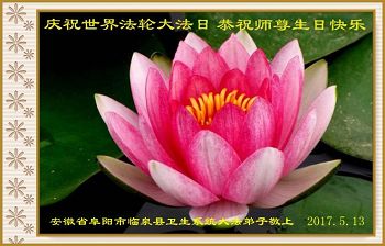我们从垃圾堆里钻来钻去的,多亏师尊救度,是师尊的手牵着我们的手,扶着我们走在返本归真的这条修炼路上,为一个大字不识的文盲开智开慧;将五毒俱全的人归正,用真、善、忍洗涤心灵;给什么都不懂的人指点迷津,跟头把式的走向成熟,成为真正的大法弟子。 用尽人类的语言,都无法表达弟子对师父的感恩的心。弟子只有坚定、精進实修。珍惜师父用巨大的承受延续来的宝贵时间,抓紧时间多学法,静心学法,向内找修自己,讲好真相,多救人,做好师父要做的三件事,让众生得救,让师父欣慰。 恭祝师尊生日快乐! 盘锦三厂学法小组大法弟子恭祝 2017年5月1日 武汉市教育系统大法弟子恭祝师父生日快乐!庆贺世界法轮大法日!