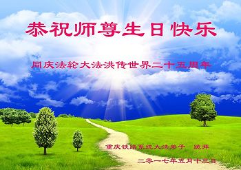 弟子一定做好三件事,多救人。 重庆铁路系统大法弟子恭祝师尊生日快乐!同庆法轮大法洪传世界二十五周年!