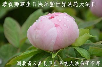 拜谢师尊的无微不至的慈悲呵护,如今要振作精神,跟上正法進程。 湖北省孝感市云梦县卫生系统大法弟子恭祝师尊生日快乐!暨世界法轮大法日!