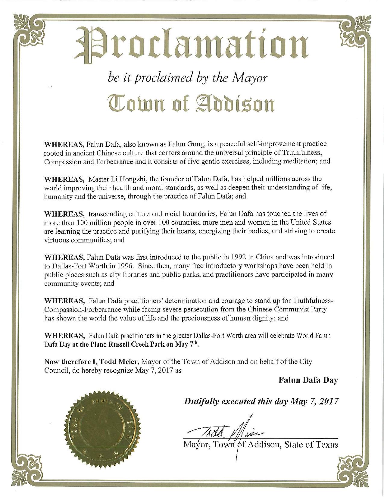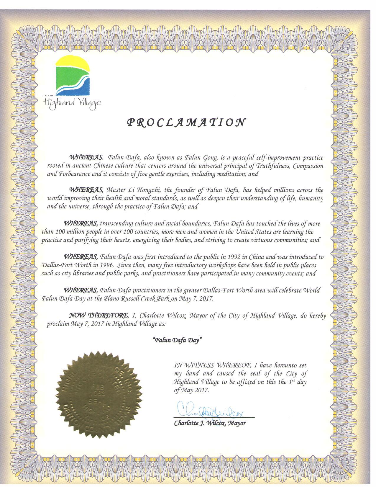 图7:美国德州海兰村市宣布“法轮大法日” |