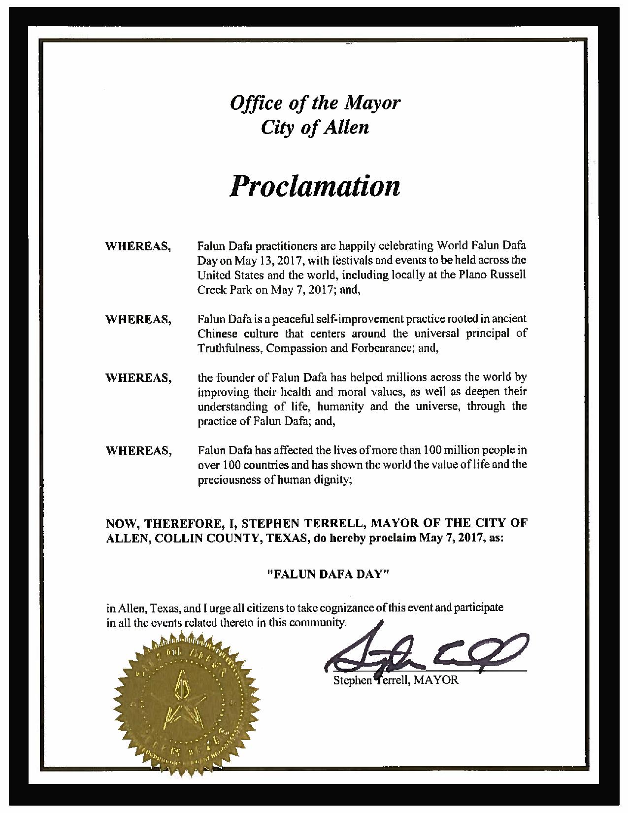 图3:美国德州艾伦市宣布“法轮大法日” |