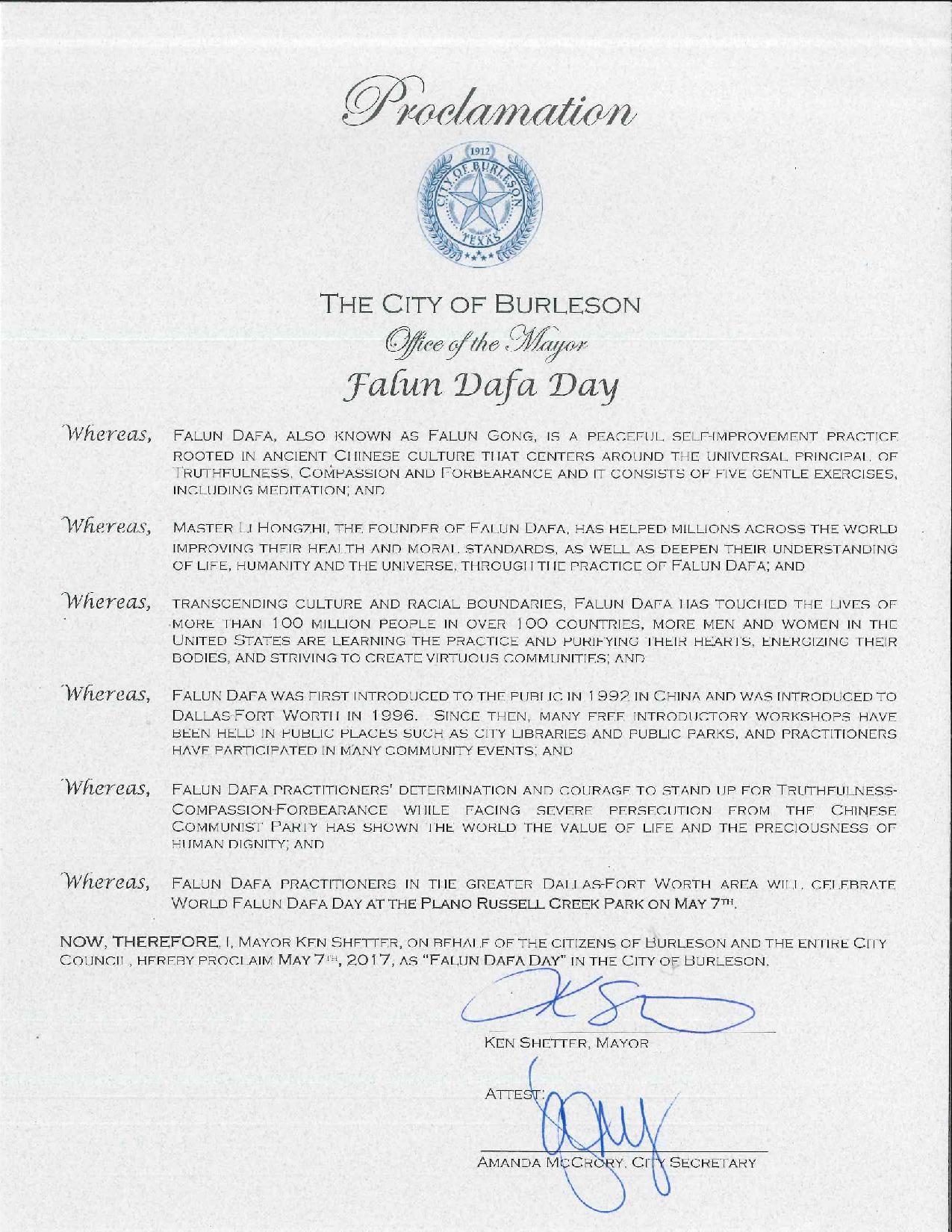 图6:美国德州伯俐逊市宣布“法轮大法日” |