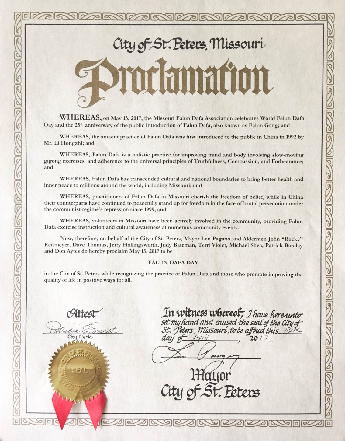 【明慧网二零一七年五月十二日】为庆祝法轮大法洪传二十五周年,美国密苏里州圣查尔斯市(St. Charles),圣彼得市(St. Peters)和温茨维尔市( Wentzville)分别颁发褒奖,颂扬真、善、忍,并宣布二零一七年五月十三日为该市法轮大法日。