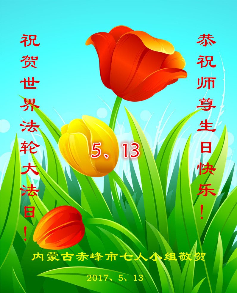 庆祝5月13日世界法轮大法日! 尊敬的师尊:弟子无以言表对您的感激之情,谢谢您对众生的慈悲救度,我们一定做好三件事,多救人,兑现誓约,圆满随师还! 内蒙古赤峰大法弟子恭贺法轮大法日!祝师父生日快乐!