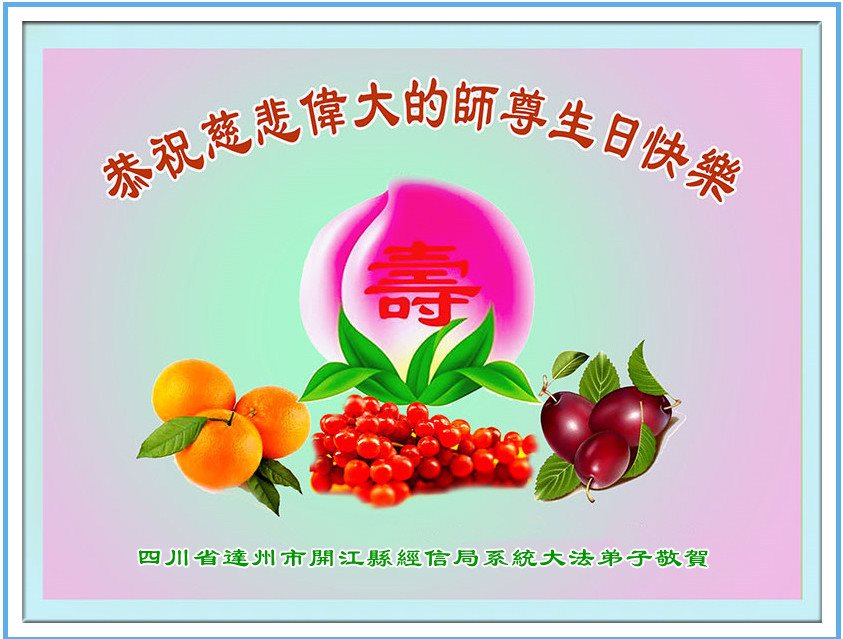 弟子想念师父,您辛苦了,盼望早日和师父团聚!一定做个合格的大法弟子,跟师父回家。弟子跪拜师父! 四川省达州市开江县经信局系统大法弟子恭祝慈悲伟大的师尊生日快乐!