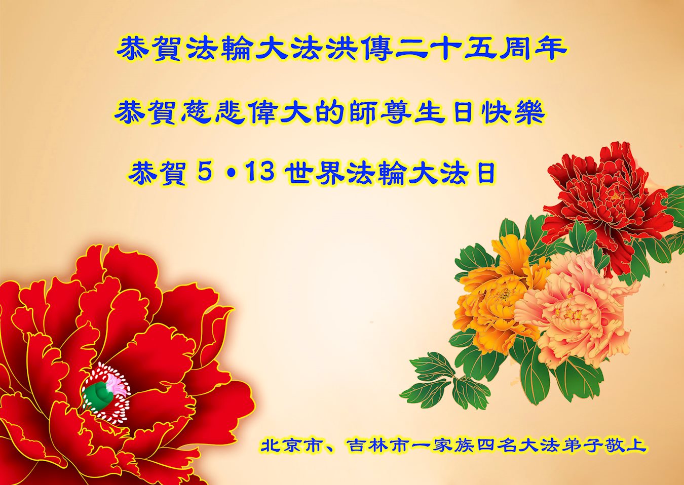带着春的回味和夏的生机,在这春暖花开的五月,我们又迎来了三个最伟大的节日——慈悲伟大师尊的六十六岁华诞!第十八届“世界法轮大法日”!法轮大法洪传世界二十五周年! 在这感恩的日子里,我们三姐妹怀着深切的喜悦与感恩跪拜,恭祝师尊生日快乐!恭贺世界法轮大法日!法轮大法洪传世界二十五周年! 用蓝天作纸,海水做墨也写不尽我们对师尊的无限感恩!千言万语汇成一句话,那就是谨记师尊的教诲,珍惜这万古修炼的机缘,时时刻刻记住自己是正法时期的大法弟子,向内找,一思一念修自己,更加精進的做好三件事,不辜负师尊的慈悲苦度,喜迎师尊回故乡。 吉林省吉林市三姐妹跪拜敬上! 二零一七年五月六日 吉林市一家大法弟子恭祝慈悲伟大的师父生日快乐!祝贺世界法轮大法日!